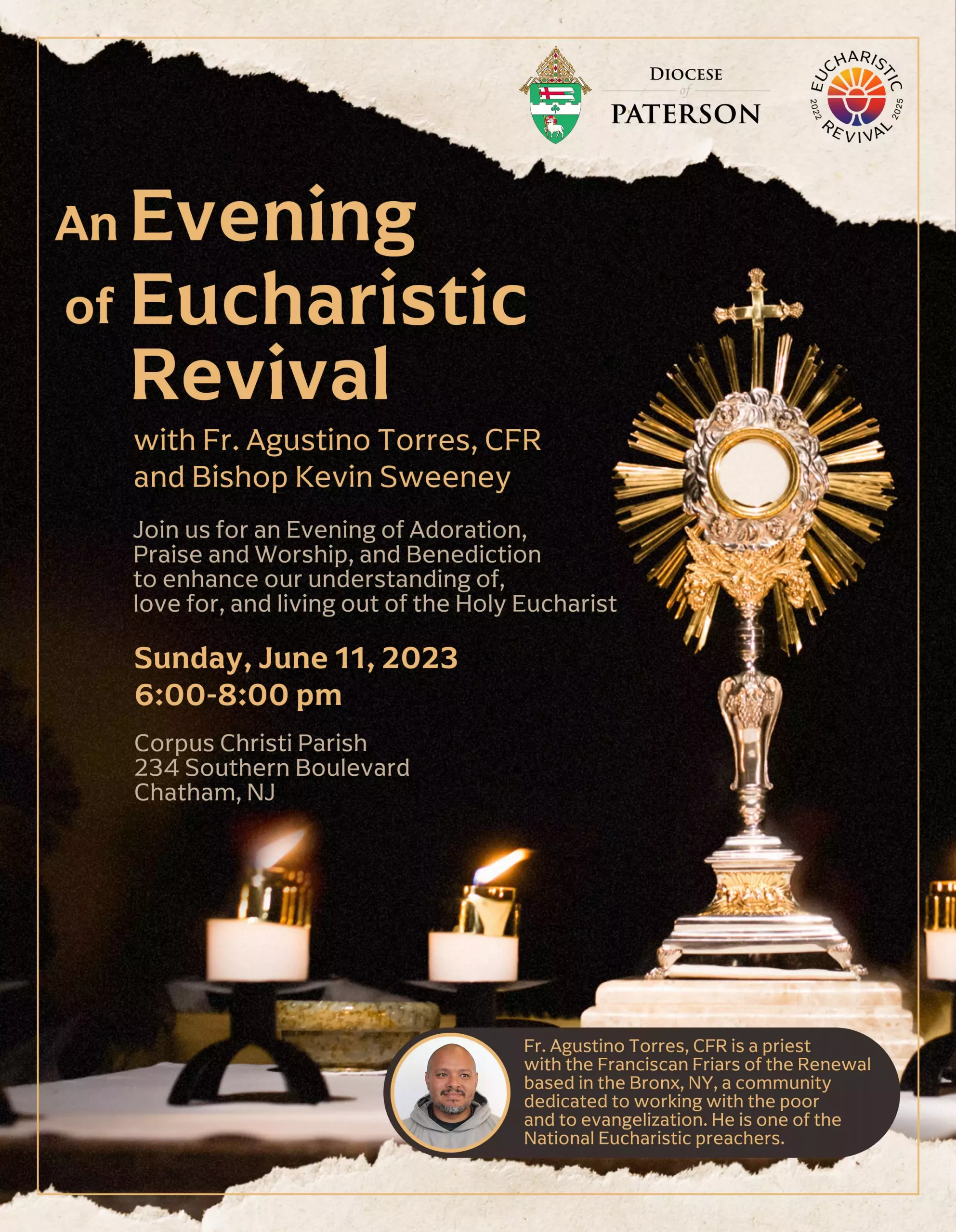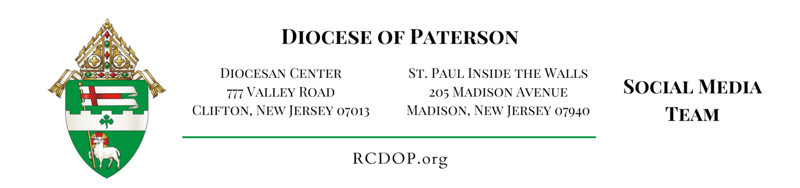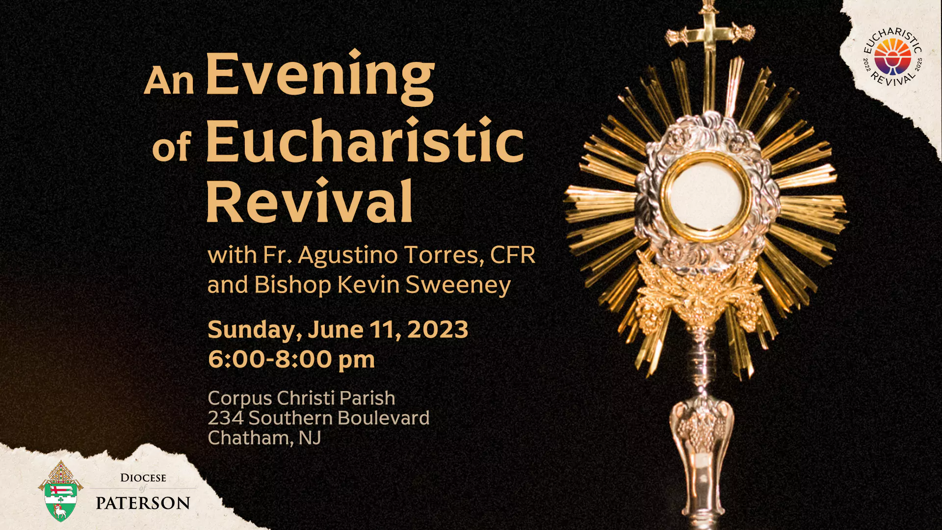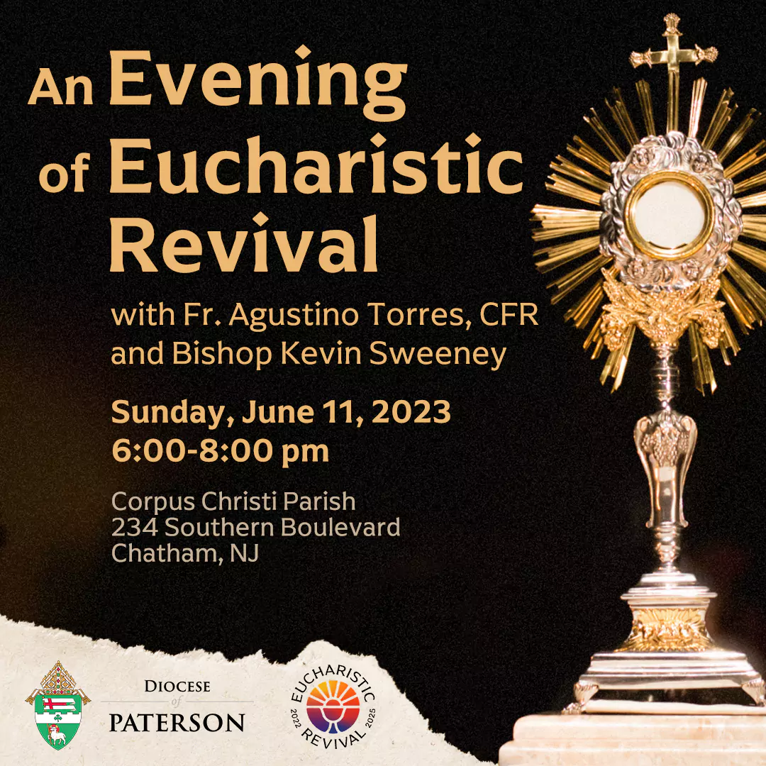 We kindly ask you to help us promote this event in your bulletin, on your website, and through social media. The attachments to this email include a flyer PDF and various graphics to use on your website, Facebook and Instagram. You may also include the link to the Diocese of Paterson Eucharistic Revival webpage found here: https://www.rcdop.org/national-eucharistic-revival.